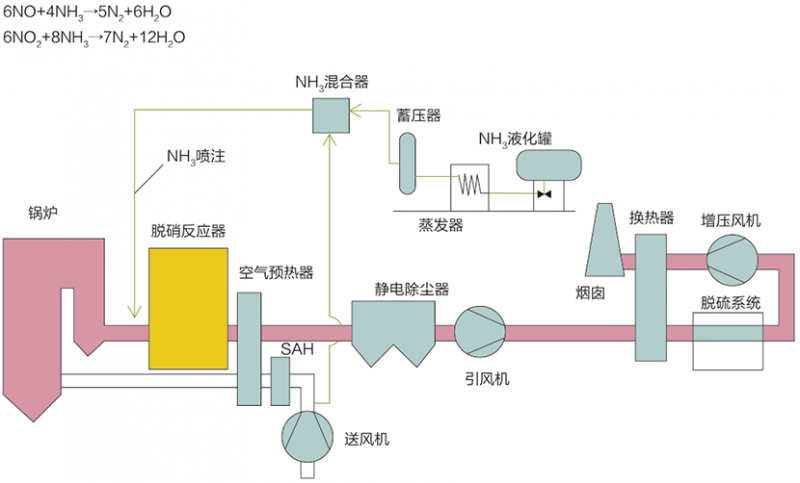 選擇性催化還原法(Selective Catalytic Reduction,簡稱SCR),在一定的反應溫度條件下,煙氣中的NOx和還原劑NH3在催化劑作用下發(fā)生還原反應,生成產(chǎn)物為N2和H2O。