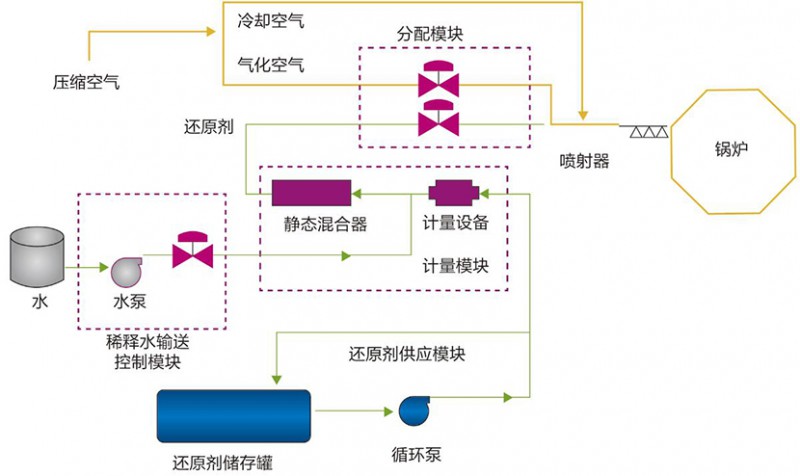 選擇性非催化還原法(Selective Non-Catalytic Reduction,簡稱SNCR),是在不需要催化劑的情況下,將氨基還原劑(尿素/氨水)噴入溫度為850~1150℃的煙氣中,還原劑有選擇性地與煙氣中的氮氧化物發(fā)生化學反應,使NOx還原生成N2和H2O的方法。